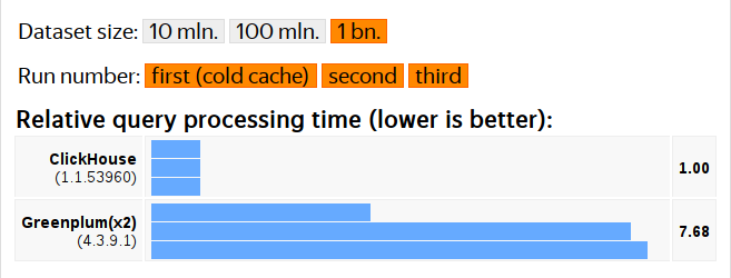 «ClickHouse shows comparable speed on this query for 30 days and 8 times faster (!) on this query. We plan to test other queries as well, haven't gotten to it yet.