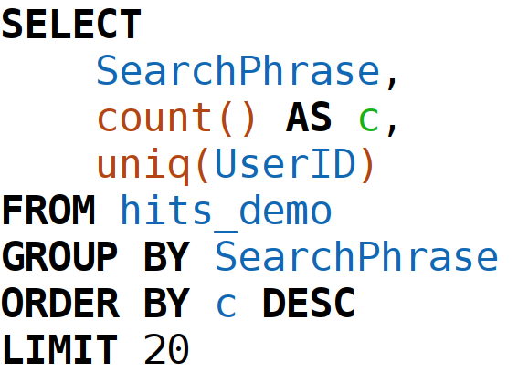 --query="SELECT SearchPhrase, count(), uniq(UserID)